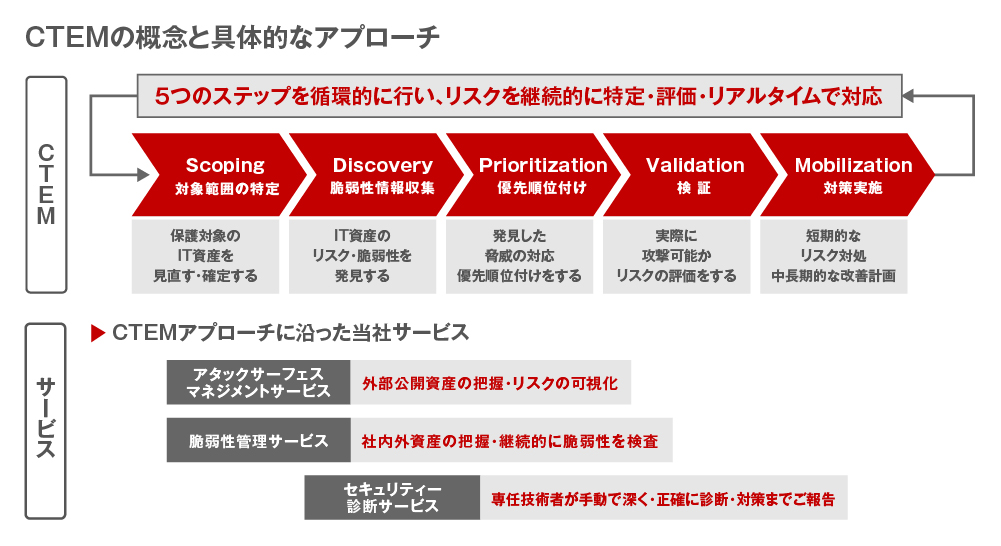 具体的に、CTEMは5つのステップを循環的に行います。保護対象のIT資産を特定し(Scoping)、IT資産のリスク・脆弱性を発見し(Discovery)、対応の優先順位付けをし(Prioritization)、実際に攻撃可能かリスクの評価をし(Validation)、短期的なリスク対処と中長期的な改善計画を実行します(Mobilization)。このサイクルを継続的に回すことで、日々変化する脅威に柔軟に対応できます。