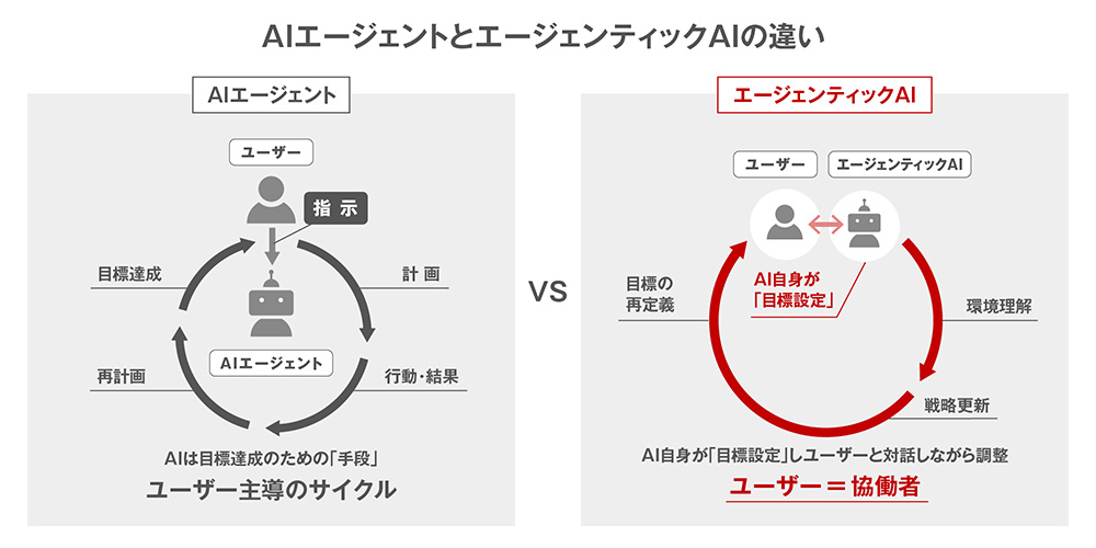 これまでのAIは人間の指示通りにこなす受動的なものでしたが、エージェンティックAIは自ら考え、行動する能動的(プロアクティブ)なものです。特定のタスクに限り能動的に行動する「AIエージェント」より自律性が高いです。