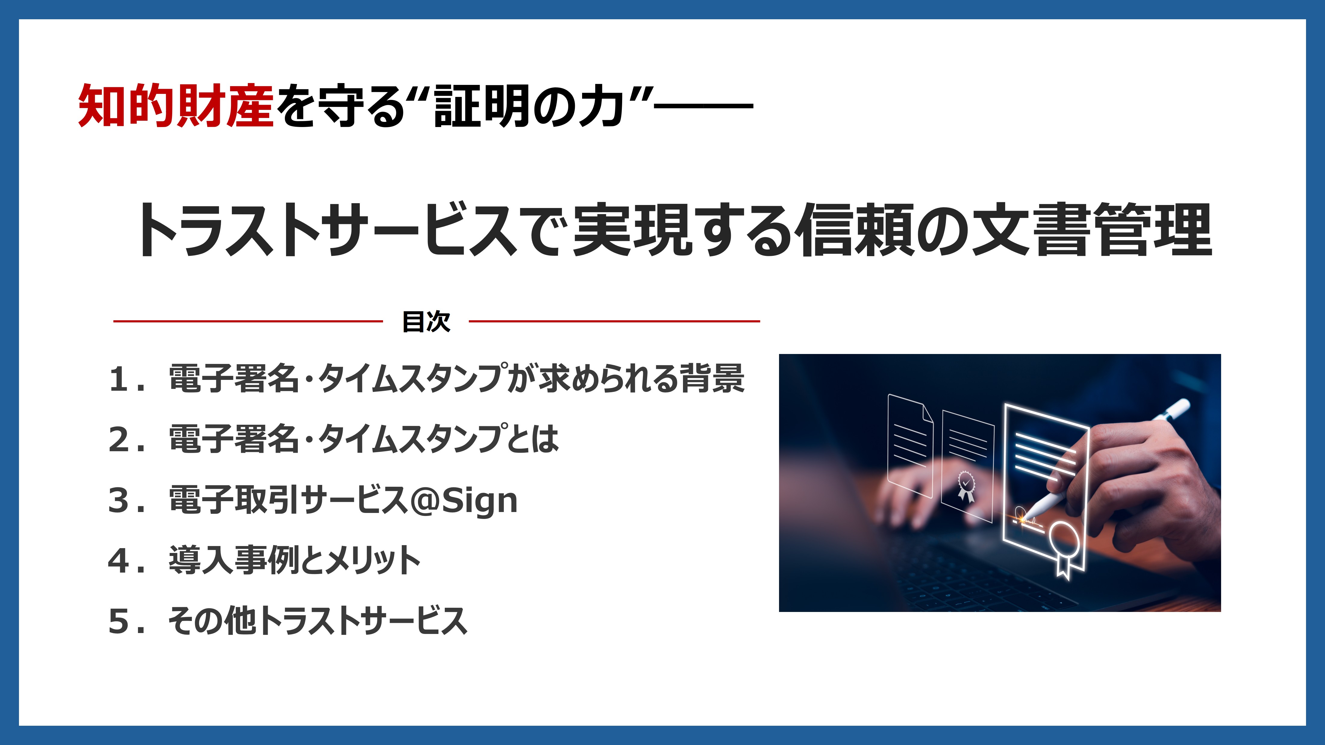 先使用権の立証に必要な証拠管理を行う場合、仕様書や製造記録など、大量の電子データを効率よく証拠化する手段が必要です。そこで有効なのが、タイムスタンプや電子署名を活用したトラストサービスです。
