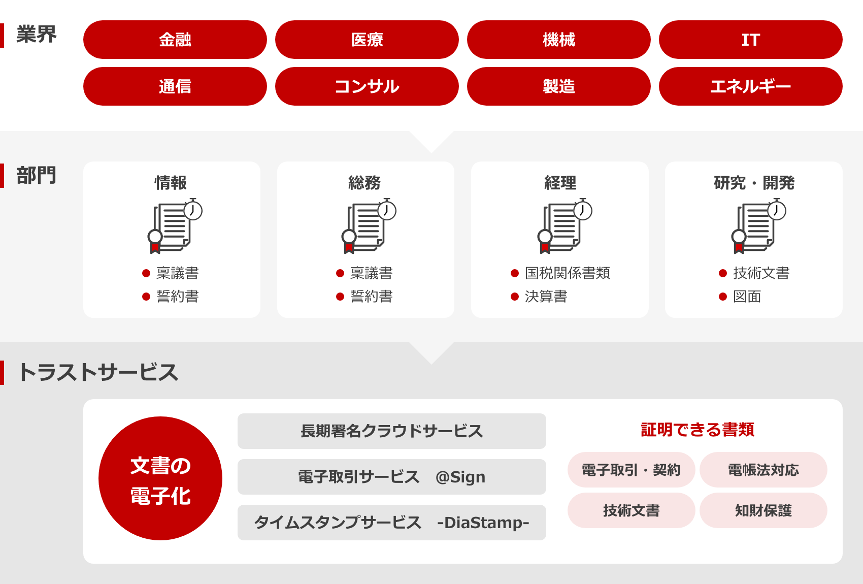また、当社が提供する「電子取引サービス@Sign」や「長期署名クラウドサービス」などのトラストサービス群により、電子署名と組み合わせた長期署名への対応ができ、既存のワークフローシステムとの連携も可能です。